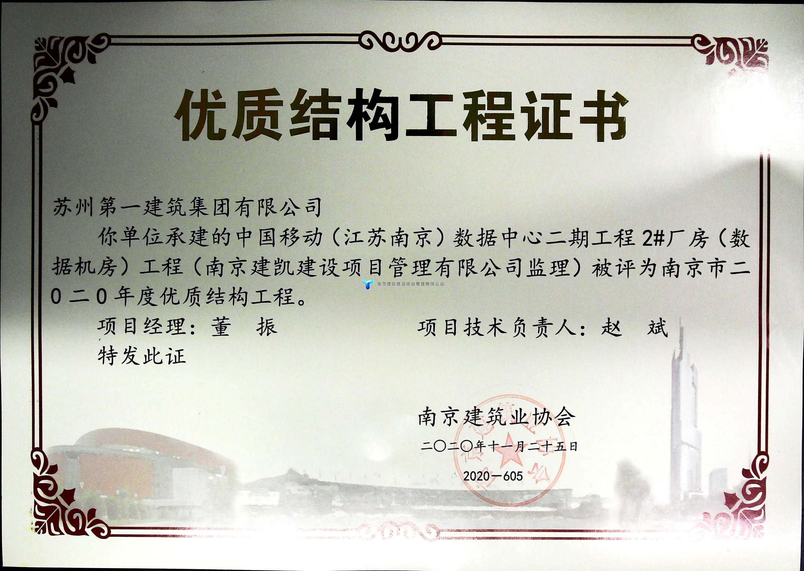 2020年榮獲優(yōu)質(zhì)結(jié)構(gòu)工程的項目——中國移動(江蘇南京)數(shù)據(jù)中心二期工程2#廠房