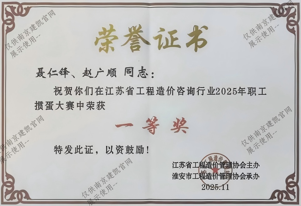 熱烈祝賀我司在江蘇省工程造價(jià)咨詢行業(yè)2025年職工摜蛋大賽中榮獲一等獎(jiǎng)