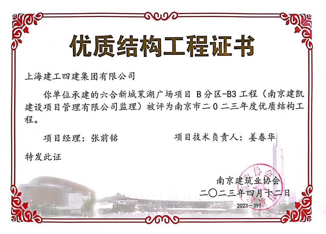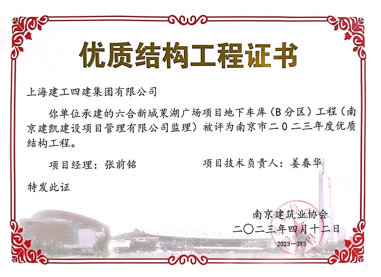 六合新城茉湖廣場(chǎng)項(xiàng)目榮獲“2023年度優(yōu)質(zhì)結(jié)構(gòu)工程”