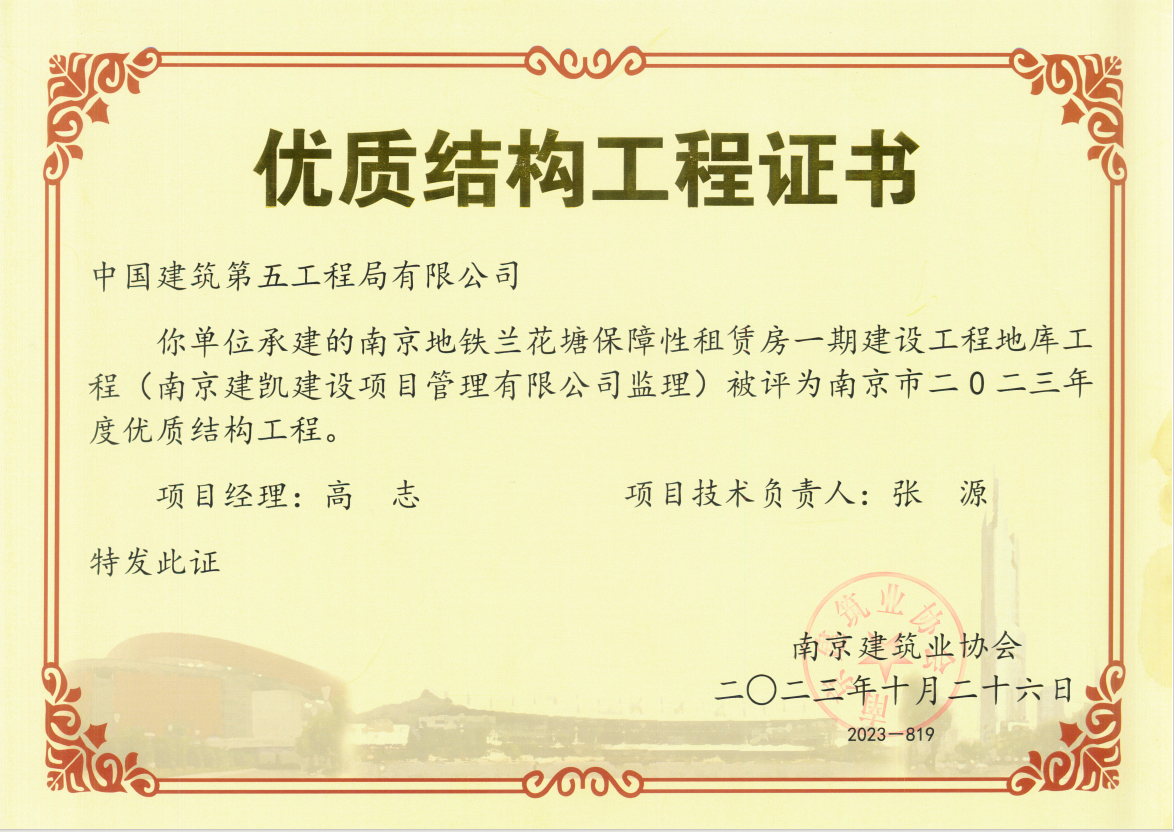 南京地鐵蘭花塘保障性租賃房一期建設(shè)工程地庫工程榮獲“優(yōu)質(zhì)結(jié)構(gòu)工程證書”