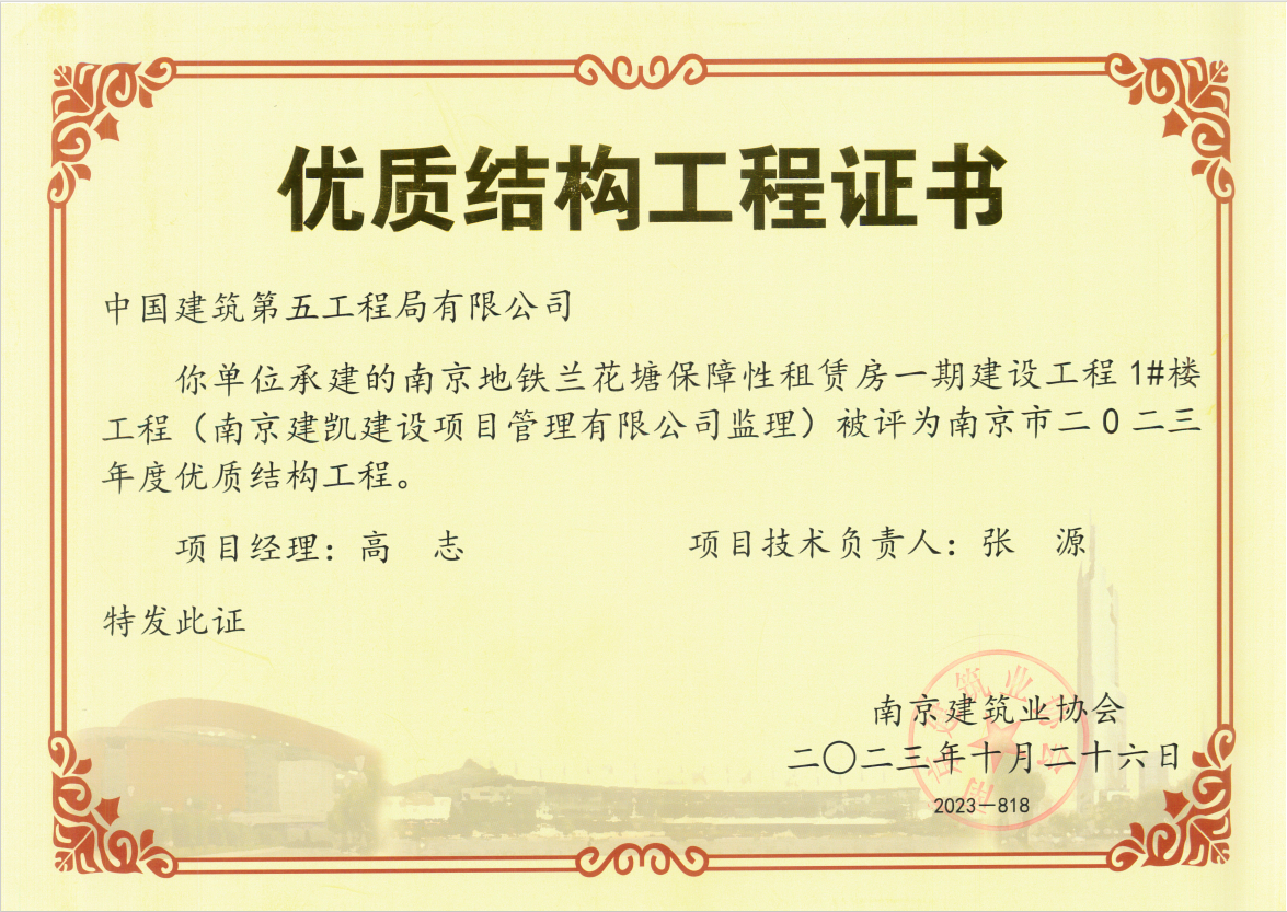 南京地鐵蘭花塘保障性租賃房一期建設(shè)工程 1#樓工程榮獲“優(yōu)質(zhì)結(jié)構(gòu)工程證書”