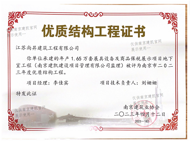 南京市二0二三年度優(yōu)質(zhì)結(jié)構(gòu)工程(年產(chǎn)1.65萬套展具設(shè)備及商品保稅展示項(xiàng)目地下室工程)